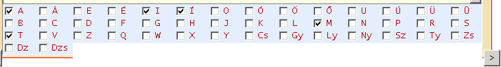A szintekhez rendelt betûkészlet kõnnyedén módosítható a fenti ábra szerint elhelyezett pipákkal. Módisítás után automatikusan új sorozat kerül az olvasnivalóba. Ha kivettünk egy betût - az már nem szerepel az új sorozatba. Ha bevettünk egy új betût, az már nagy valószínüséggel szerepelni fog a szavakban.