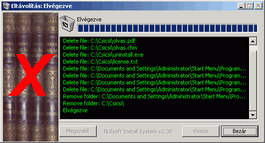 Ezen a lapon az eltávolítás menete követhetõ nyomon. Ha minden rendben lezajlott a "Bezár" gomb megnyomásával fejezzük be a program eltávolítását.